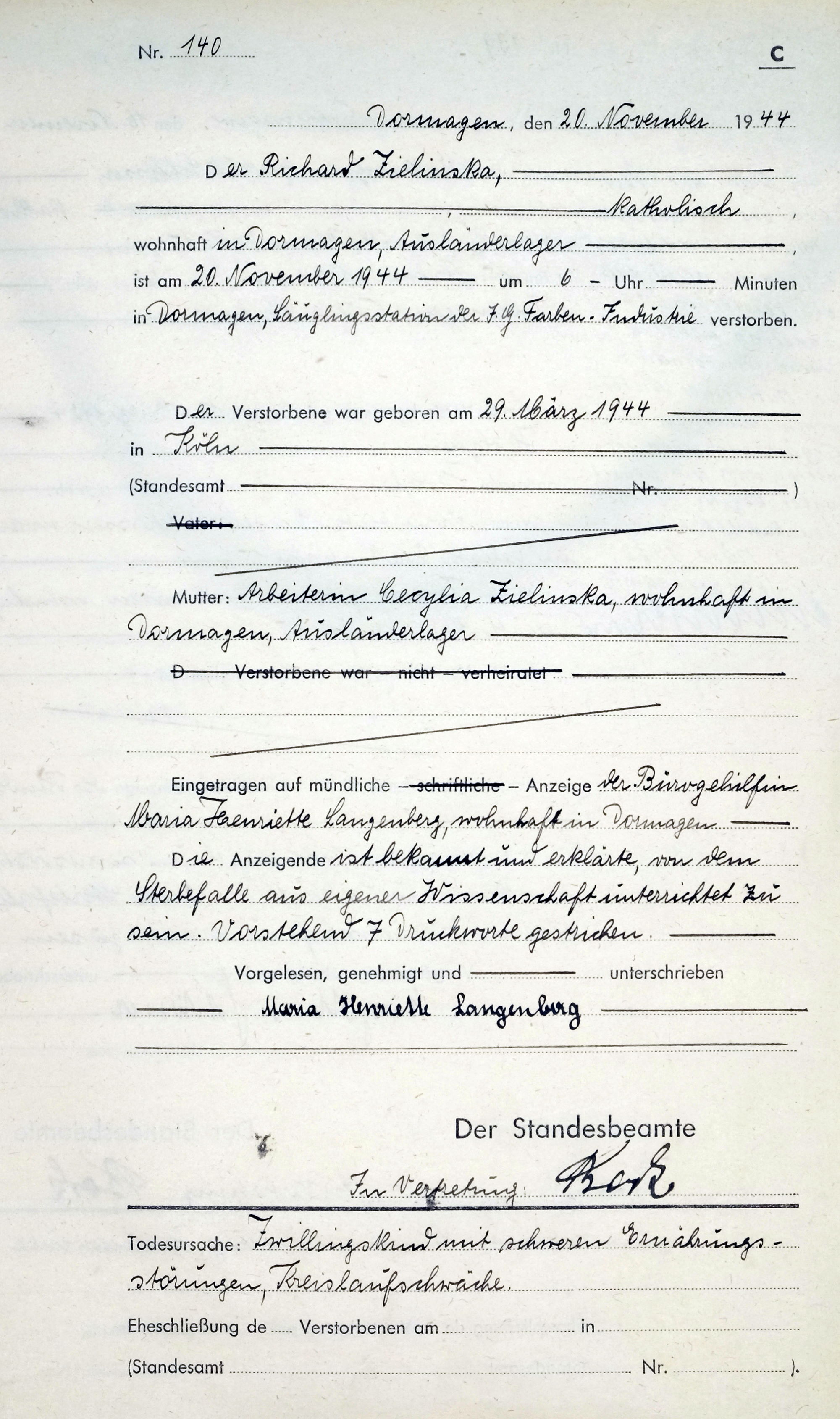 | aktuell | 14:33, 5. Jan. 2015 | 2.000 × 3.377 (854 KB) | KlausErdmann (Diskussion • Beiträge) | {{Information |Beschreibung = ;Standesamt Dormagen, Sterbeurkunde Nr.140/1944 verstorbene Ausländerkinder des 2. Weltkrieges in Dormagen |Quelle = selbst fotografiert |Urheber = Archiv im Rhein-Kreis Neuss |Datum = 1944 |Scans = [[Benutz |