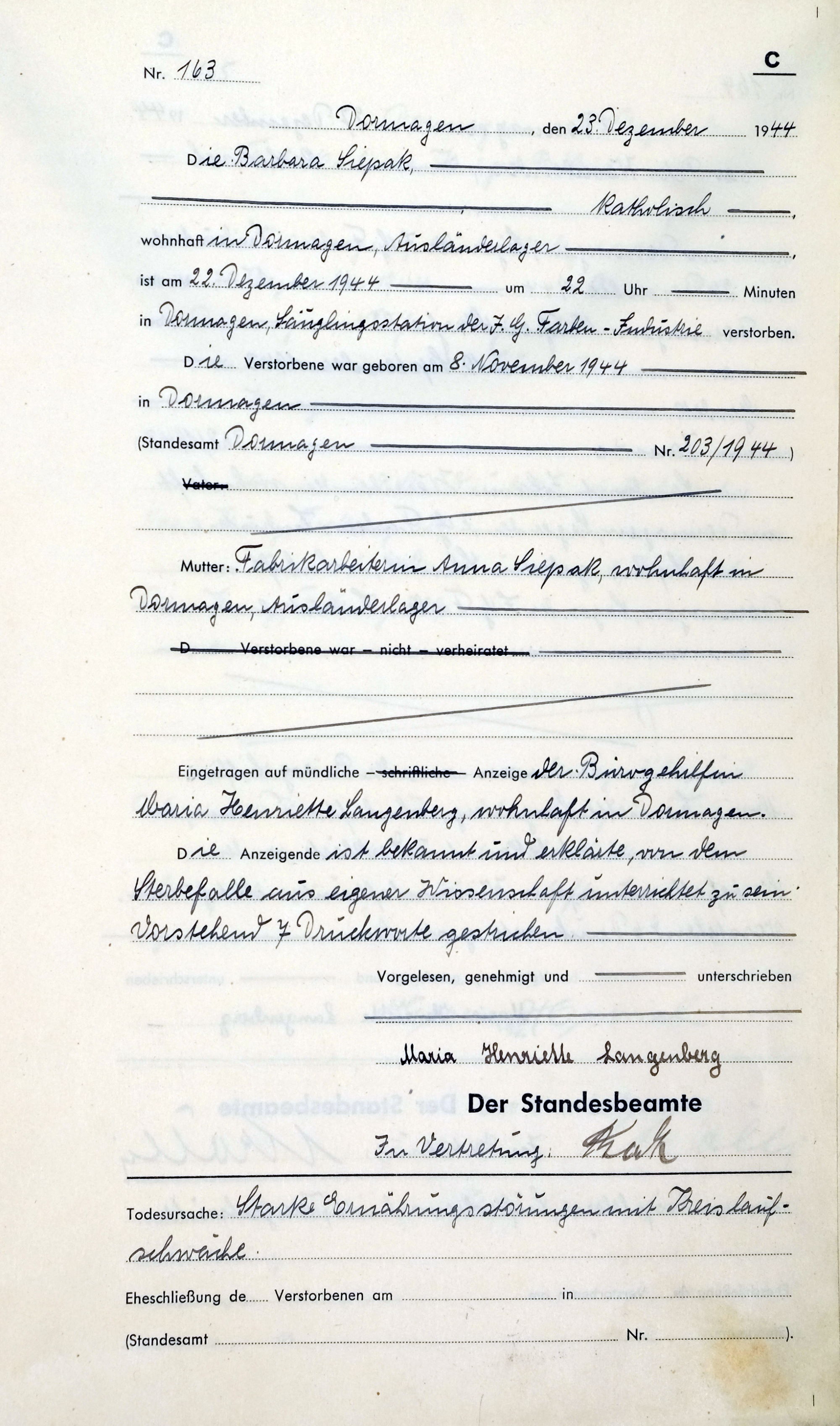| aktuell | 14:37, 5. Jan. 2015 | 2.000 × 3.393 (847 KB) | KlausErdmann (Diskussion • Beiträge) | {{Information |Beschreibung = ;Standesamt Dormagen, Sterbeurkunde Nr.163/1944 verstorbene Ausländerkinder des 2. Weltkrieges in Dormagen |Quelle = selbst fotografiert |Urheber = Archiv im Rhein-Kreis Neuss |Datum = 1944 |Scans = [[Benutz |