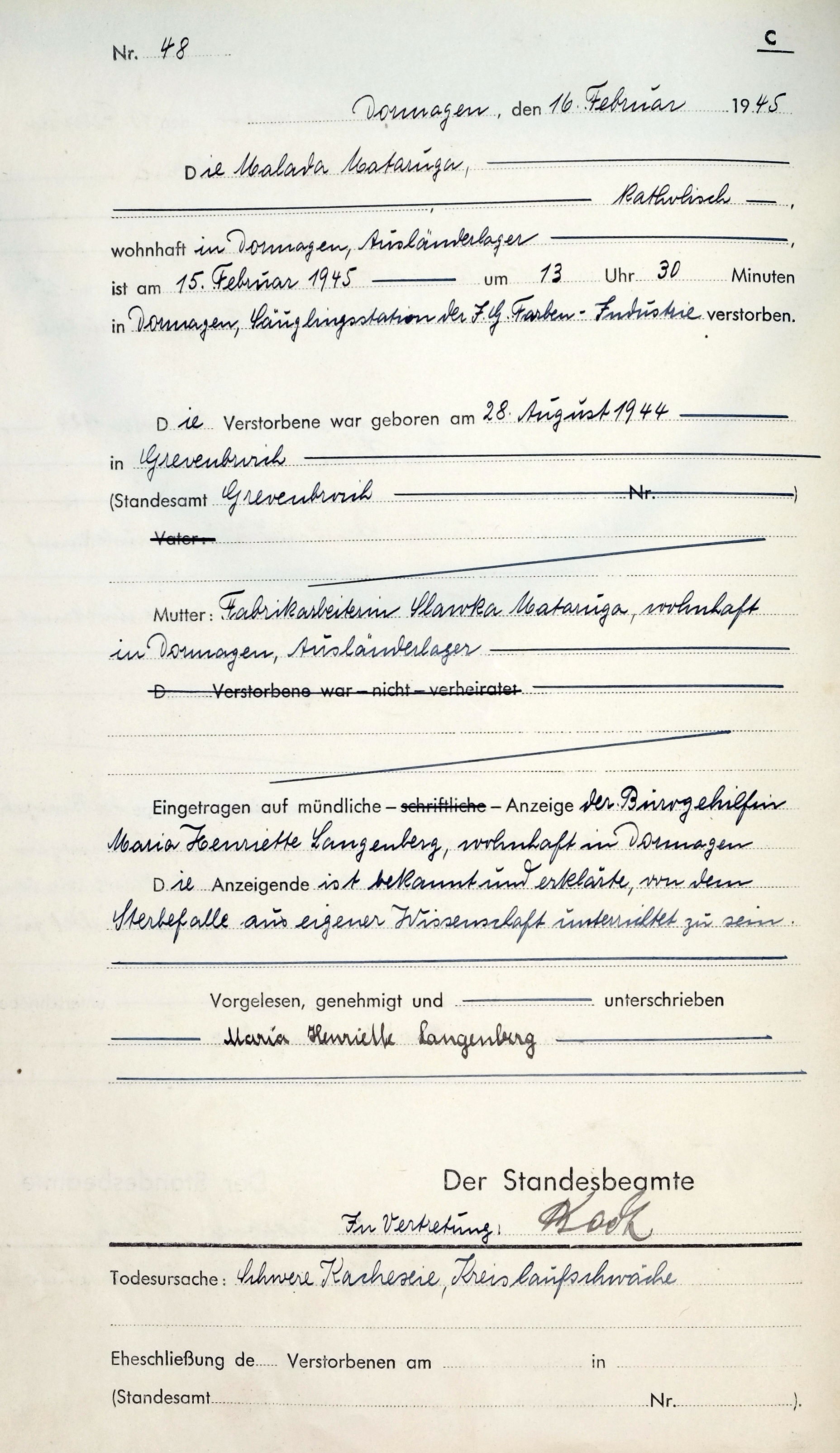 | aktuell | 14:44, 5. Jan. 2015 | 1.856 × 3.210 (754 KB) | KlausErdmann (Diskussion • Beiträge) | {{Information |Beschreibung = ;Standesamt Dormagen, Sterbeurkunde Nr.48/1945 verstorbene Ausländerkinder des 2. Weltkrieges in Dormagen |Quelle = selbst fotografiert |Urheber = Archiv im Rhein-Kreis Neuss |Datum = 1945 |Scans = [[Benutze |