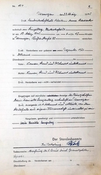 | aktuell | 19:17, 26. Jan. 2015 | 1.241 × 2.140 (532 KB) | KlausErdmann (Diskussion • Beiträge) | {{Information |Beschreibung = ;Standesamt Dormagen, Sterbeurkunde Nr.104/1945 in Dormagen verstorbener Ausländer des 2. Weltkrieges |Quelle = selbst fotografiert |Urheber = Archiv im Rhein-Kreis Neuss |Datum = 1945 |Scans = [[Benutzer:Kl |