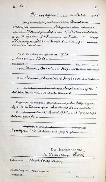 Standesamt Dormagen, Sterbeurkunde Nr.143/1945
