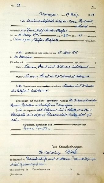 | aktuell | 19:17, 26. Jan. 2015 | 1.197 × 2.110 (446 KB) | KlausErdmann (Diskussion • Beiträge) | {{Information |Beschreibung = ;Standesamt Dormagen, Sterbeurkunde Nr.92/1945 in Dormagen verstorbener Ausländer des 2. Weltkrieges |Quelle = selbst fotografiert |Urheber = Archiv im Rhein-Kreis Neuss |Datum = 1945 |Scans = [[Benutzer:Kla |