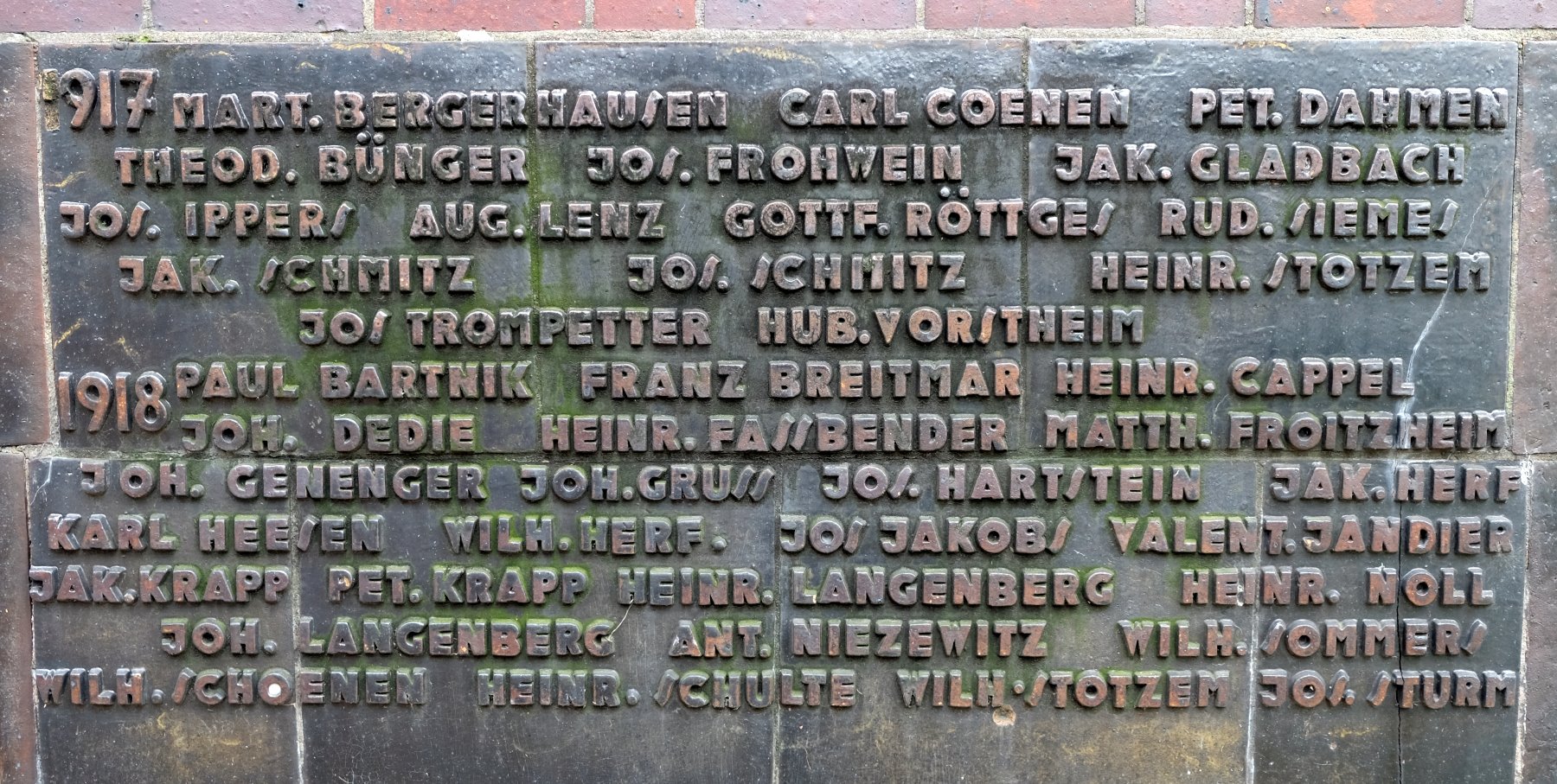 | aktuell | 10:48, 5. Dez. 2014 | 1.800 × 907 (494 KB) | KlausErdmann (Diskussion • Beiträge) | {{Information |Beschreibung = Ehrenfriedhof an der Nettergasse in der Stadt Dormagen ;Gedenktafel mit den Namen der Kriegsopfer des I. Weltkrieges (1914-1918) |Quelle = selbst fotografiert |Urheber = K. Erdmann |