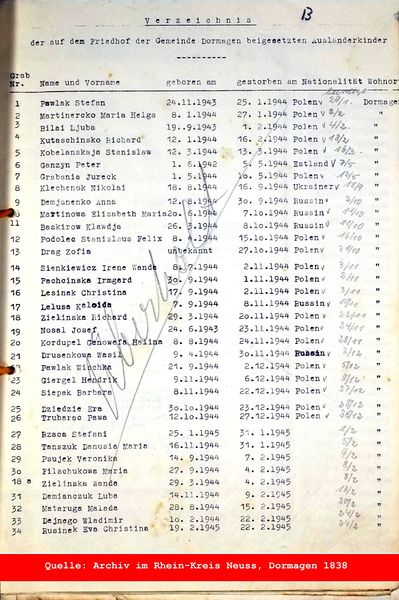 Verzeichnis der auf dem Friedhof der Gemeinde Dormagen beigesetzten Ausländerkinder im II. Weltkrieg