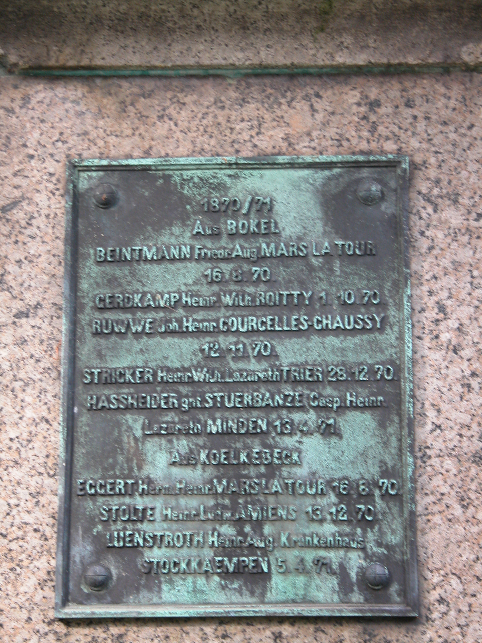 | aktuell | 23:08, 23. Jun. 2013 | 1.920 × 2.560 (1,56 MB) | Wilkinus (Diskussion • Beiträge) | {{Information |Beschreibung = Inschrifttafel am Sockel des Kriegerdenkmals 1866+1870/71 in Halle in Westfalen |Quelle = eigene Fotos |Urheber = Peter Wittgens |Datum = 11.08.2008 |Genehmigung = |Andere_Versionen = |Anmerkungen = }} [[Category:Images |