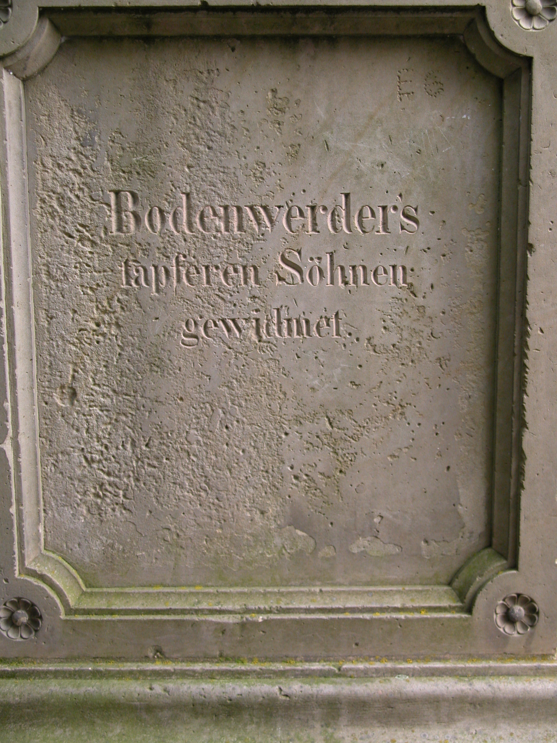 | aktuell | 21:55, 14. Mär. 2017 | 1.920 × 2.560 (1,61 MB) | Wilkinus (Diskussion • Beiträge) | {{Information |Beschreibung = Kriegerdenkmal 1870/71 in Bodenwerder: Inschrift am Sockel |Quelle = eigenes Foto |Urheber = Peter Wittgens |Datum = 20.09.2009 |Scans = |Genehmigung = |Andere_Versionen = |Anmerkungen = }} [[Category:Images {{subst:REV |
