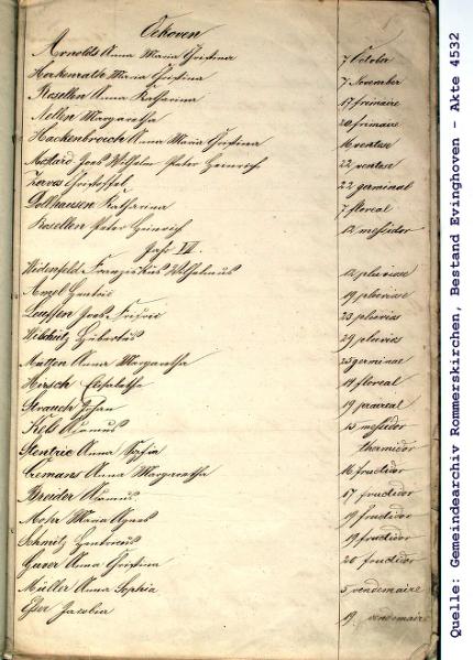 | aktuell | 14:53, 12. Sep. 2010 | 1.834 × 2.618, 18 Seiten (6,51 MB) | KlausErdmann (Diskussion • Beiträge) | {{Information |Beschreibung = ;Register der Geburts-Urkunden der Bürgermeister(ei) Evinghoven vom Jahr 1798 (Teil 1):beginnend mit Oekoven - Arnolds, Anna Maria Christina<br />endend mit Weigold, Maria Anna im VI. Jahr der französ. Repubklik |Quelle = |