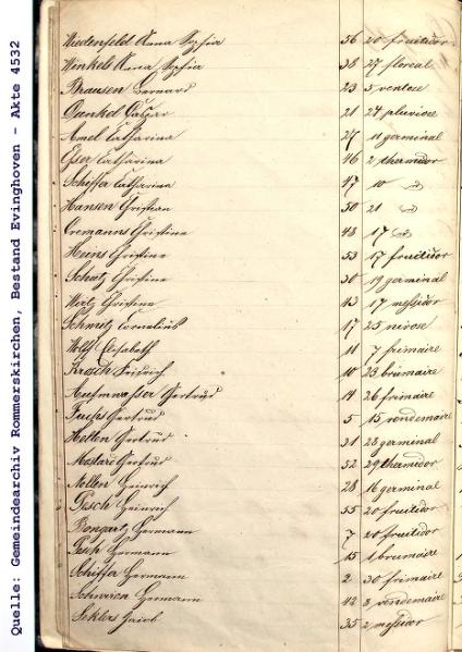 | aktuell | 14:53, 12. Sep. 2010 | 1.834 × 2.618, 18 Seiten (6,51 MB) | KlausErdmann (Diskussion • Beiträge) | {{Information |Beschreibung = ;Register der Geburts-Urkunden der Bürgermeister(ei) Evinghoven vom Jahr 1798 (Teil 1):beginnend mit Oekoven - Arnolds, Anna Maria Christina<br />endend mit Weigold, Maria Anna im VI. Jahr der französ. Repubklik |Quelle = |