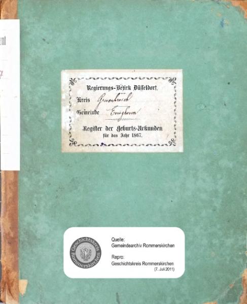 | aktuell | 11:05, 8. Jul. 2011 | 1.527 × 1.881, 42 Seiten (14,43 MB) | KlausErdmann (Diskussion • Beiträge) | {{Information |Beschreibung = ;Bürgermeisterei Evinghoven:Geburts-Register von 1867 |Quelle = Gemeindearchiv Rommerskirchen |Urheber = |Datum = 1867 |Scans = Klaus Erdmann ''(Repro: 7. Juli 20 |