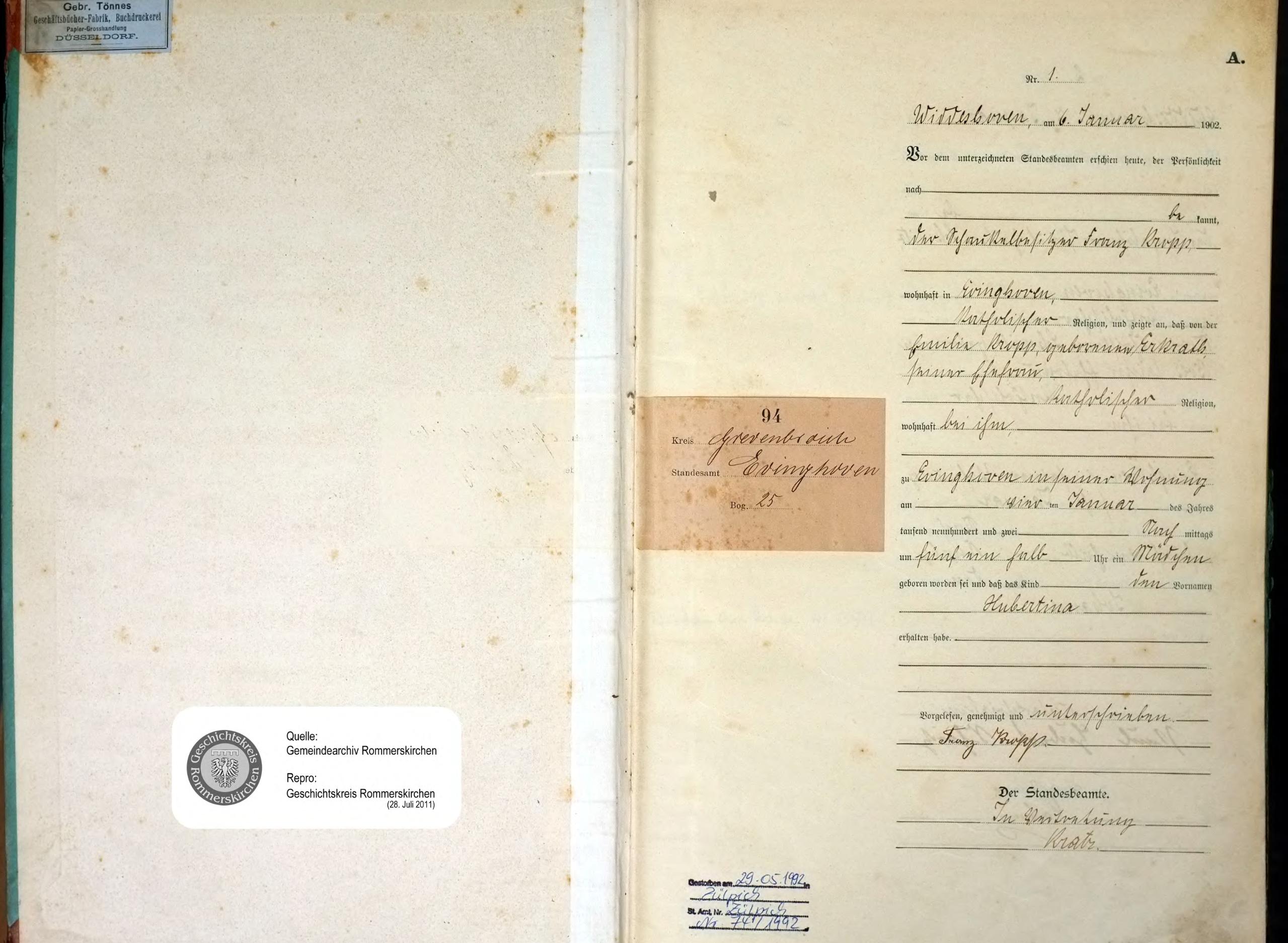 | aktuell | 15:29, 29. Jul. 2011 | 1.656 × 2.566, 41 Seiten (15,57 MB) | KlausErdmann (Diskussion • Beiträge) | {{Information |Beschreibung = ;Bürgermeisterei Evinghoven:Register der Geburts-Urkunden 1902 |Quelle = Gemeindearchiv Rommerskirchen |Urheber = |Datum = 1902 |Scans = Klaus Erdmann ''(Repro: 2 |