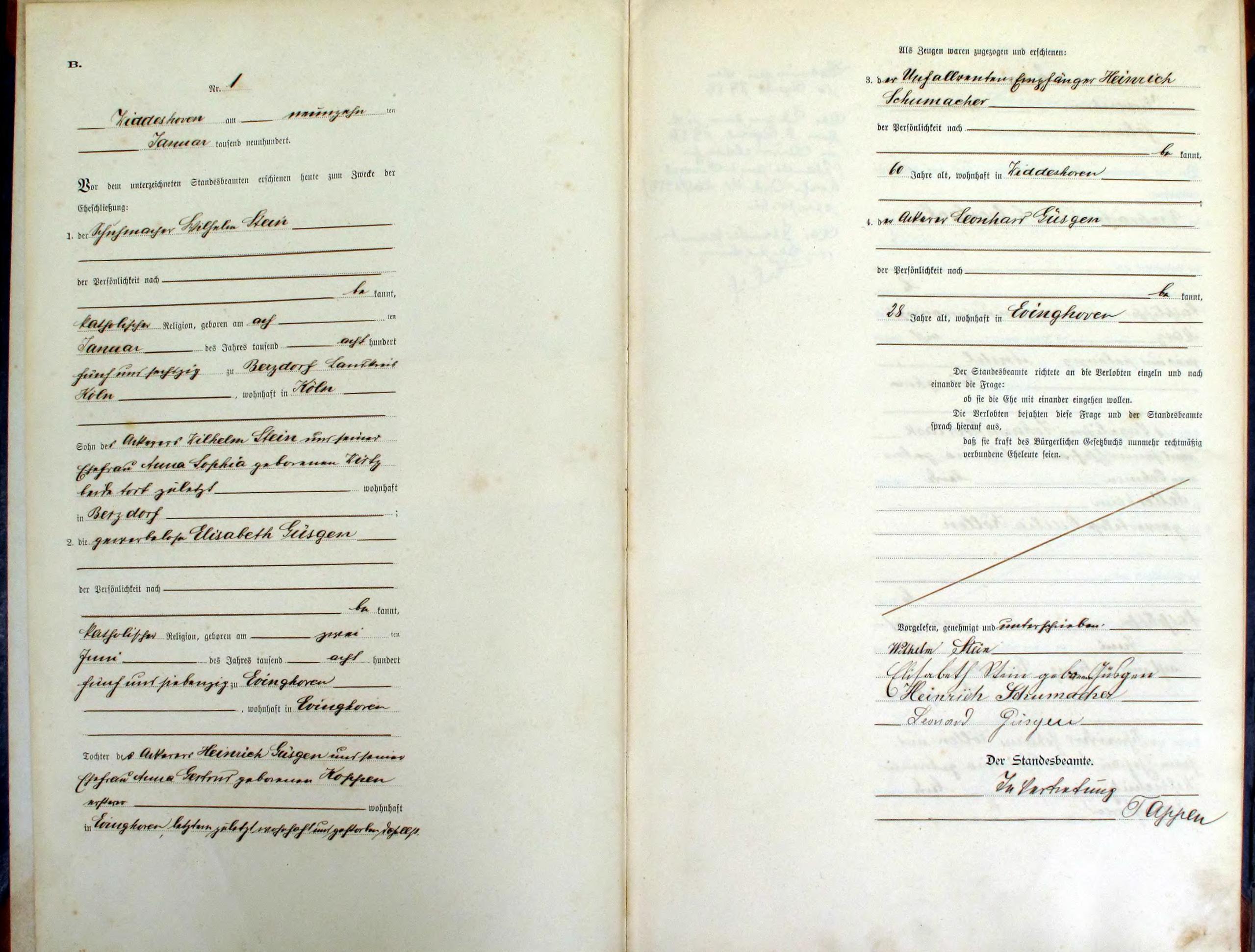 | aktuell | 10:01, 27. Mai 2011 | 1.444 × 2.284, 26 Seiten (7,55 MB) | KlausErdmann (Diskussion • Beiträge) | {{Information |Beschreibung = ;Standesamt Evinghoven:Register der Heirats-Urkunden für das Jahr 1900 |Quelle = Gemeindearchiv Rommerskirchen |Urheber = |Datum = 1900 |Scans = Klaus Erdmann ''( |