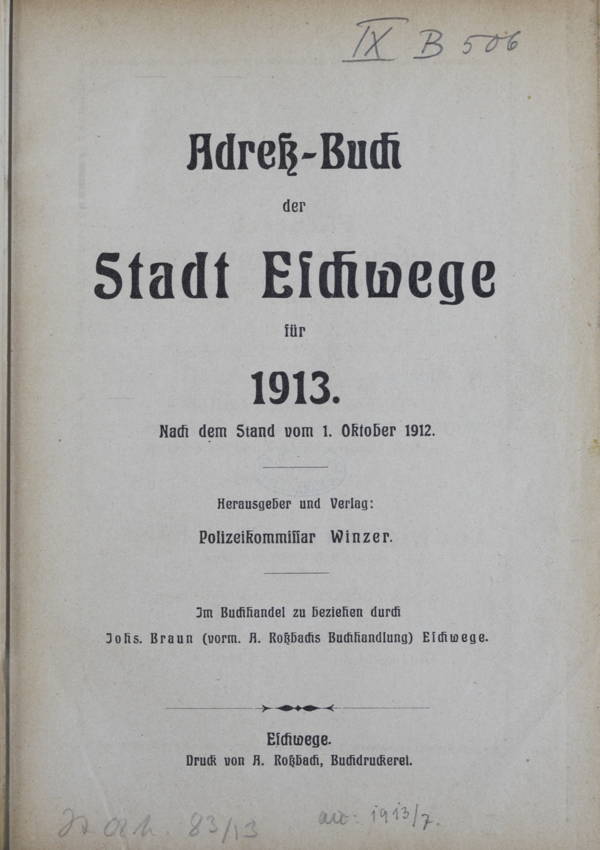 | aktuell | 19:07, 17. Nov. 2023 | 600 × 850 (45 KB) | GStoll (Diskussion • Beiträge) | {{Information |Beschreibung = Adreßbuch der Stadt Eschwege 1913 |Quelle = Original im Hessischen Staatsarchiv, Staatsarchiv Marburg |Urheber = Druck von H. Roßbach, Eschwege |Datum = 1913 |Scans = Horst Reinhardt |Genehmigung = {{Lizenz-AB}} |Andere_Versionen = |Anmerkungen = In Kooperation mit dem Hessischen Staatsarchiv, Staatsarchiv Marburg Staatsarchiv_Marburg }} Kategorie:Adressbuch [[Kategorie:Adressbuch 191… |