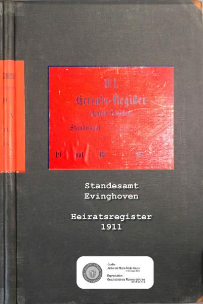aktuell14:37, 28. Feb. 2013Vorschaubild der Version vom 14:37, 28. Feb. 20131.581 × 2.365, 21 Seiten (6,67 MB)KlausErdmann (Diskussion • Beiträge){{Information |Beschreibung = ;Standesamt Evinghoven, Heiratsregister 1911 |Quelle = Archiv im Rhein-Kreis Neuss |Urheber = |Datum = 1911 |Scans = Klaus Erdmann ''(Repro: 28. Februar 2013)'' |Genehmigung =