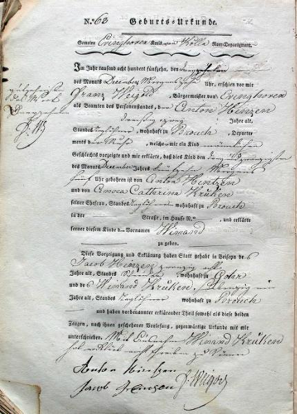 | aktuell | 11:33, 10. Nov. 2010 | 1.625 × 2.724, 7 Seiten (4,78 MB) | KlausErdmann (Diskussion • Beiträge) | {{Information |Beschreibung = ;Gemeinde Evinghoven:Geburts-Urkunden Nr. 61 bis 66/1815 |Quelle = Gemeindearchiv Rommerskirchen |Urheber = |Datum = 1815 |Scans = Klaus Erdmann 12. Aug. 2010 |
