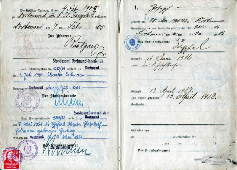 | aktuell | 08:30, 18. Feb. 2011 | 821 × 1.186, 4 Seiten (786 KB) | KlausErdmann (Diskussion • Beiträge) | {{Information |Beschreibung = ;Familienbuch von Theodor Erdmann & Maria Elisabeth Herting aus Dortmund: standesamtliche Heirat am 3. Februar 1905 |Quelle = Privatbesitz der Familie Klaus Erdmann |Urheber = |Datum = um 1905 |Scans = [[User:KlausErdmann|Kl |