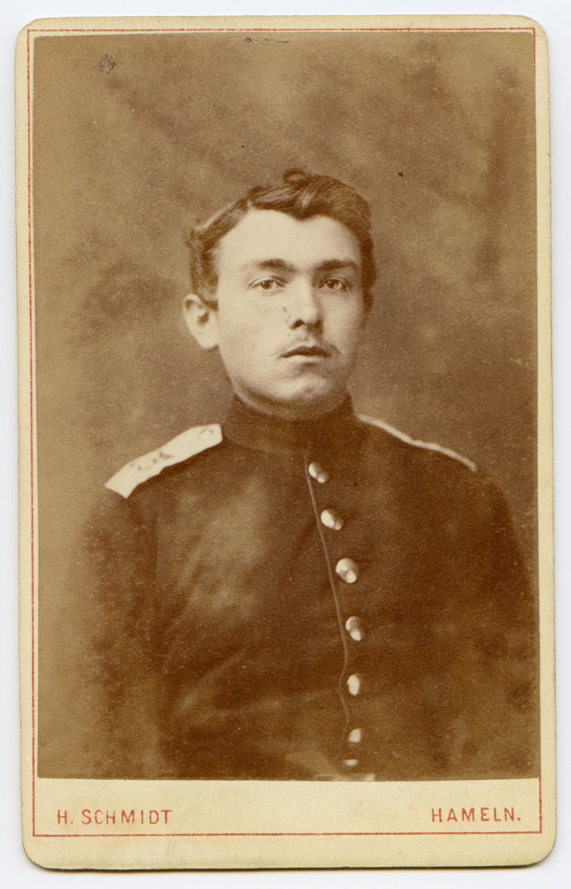 Soldat, vermutl. vom Füsilier-Regiment Feldmarschall Prinz Albrecht von Preußen (Hannoversches) Nr.73, Fotostudio, weitere Details siehe unter "Dateiverwendungen" | |