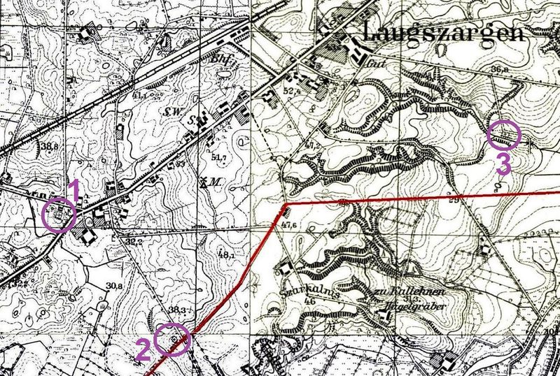 Ausschnitt aus dem Messtischblatt 0798 Uszkullmen, 0799 Laugszargen, 0898 Willkischken, Lage der Friedhöfe in Laugszargen (1:25 000) | ||||