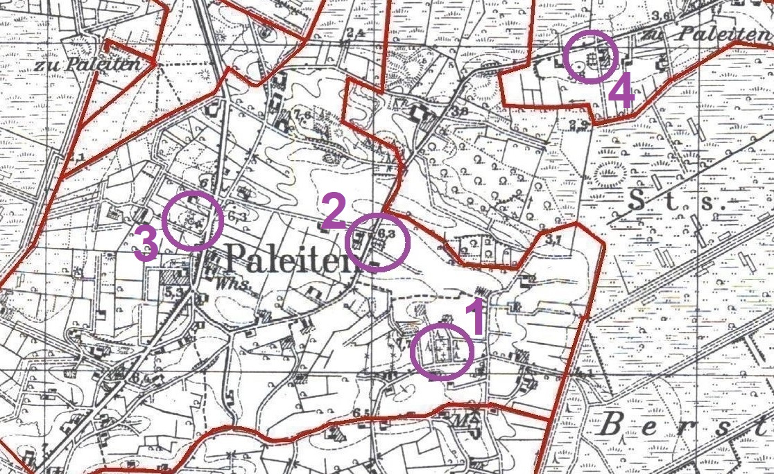 Ausschnitt aus dem Messtischblatt 0795 Uszlöknen, Lage der Friedhöfe in Paleiten (1:25 000) | ||||