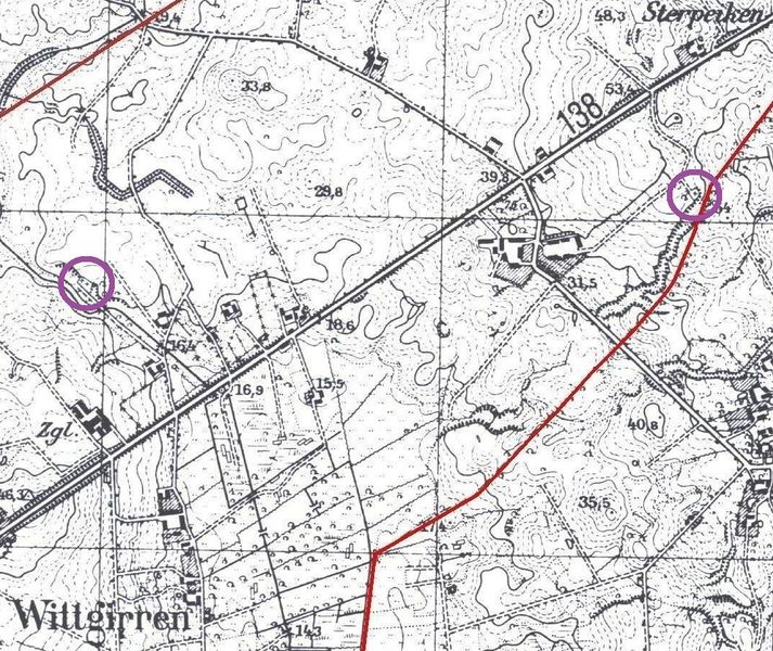 Ausschnitt aus dem Messtischblatt 0898 Willkischken, Lage der Friedhöfe in Wittgirren (1:25 000) | ||||