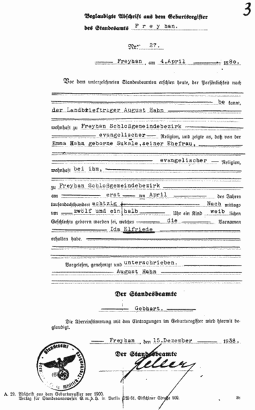 birth certification from Freyhan, Silesia