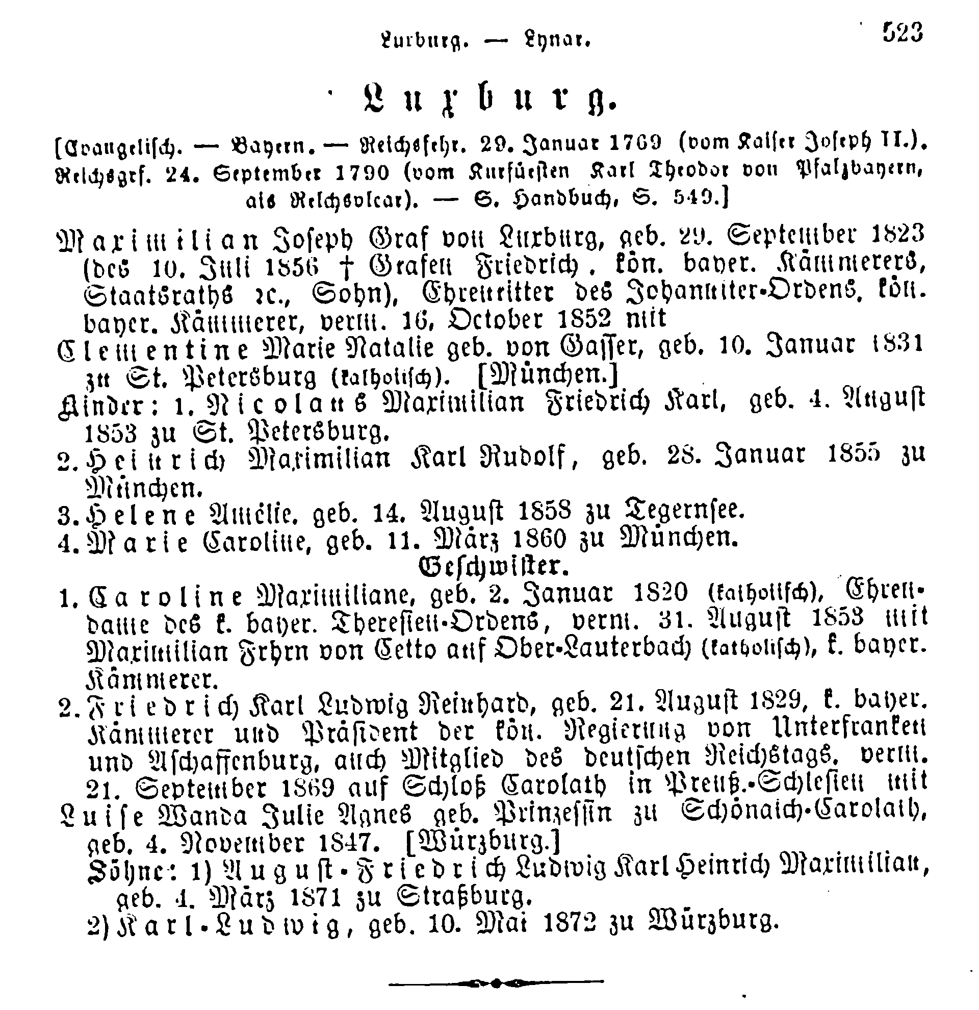 oberer Teil der Seite 523 aus Gothaisches Genealogisches Taschenbuch der Gräflichen Häuser 1874 | ||