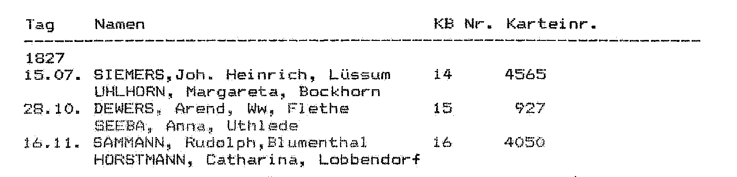 W. Putze, E. Gerloff 1994: "REGISTER der Eheschließungen aus dem Kirchspiel Blumenthal von 1695 bis 1875"