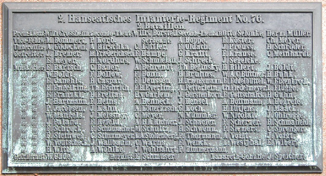 Regiments-Kriegerdenkmal 1870/71 des Infanterie-Regiments Hamburg (2. Hanseatisches) Nr. 76 in Hamburg-Rotherbaum: Gedenktafel 1: Für die Gefallenen des 2. Bataillons | |||