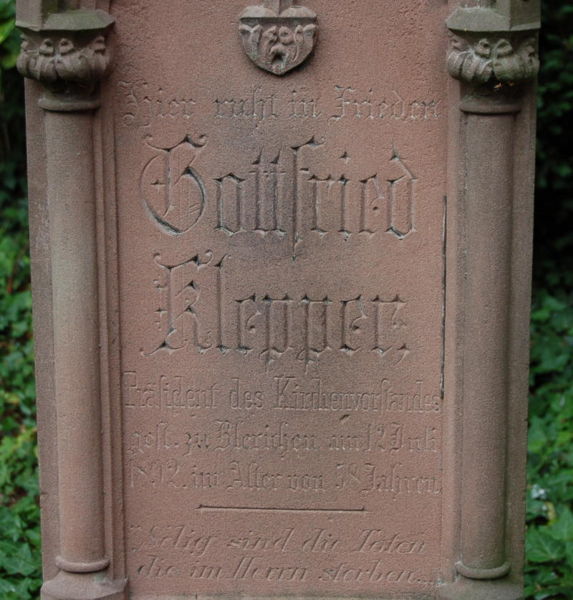 Grabinschrift des Gottfried Klepper (+1892) auf dem Friedhof an der alten Kirche in Kirdorf (Bedburg/Erft) | |||