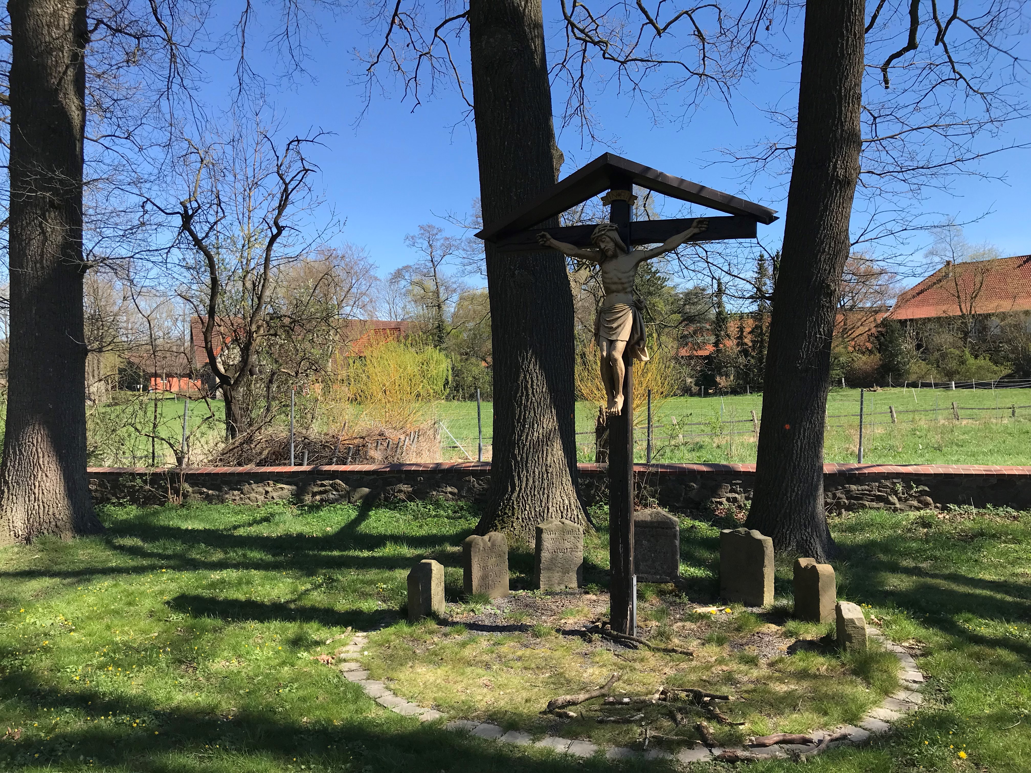 Grabsteine und Kreuz hinter der Alten St. Alexander Kirche in Wallenhorst