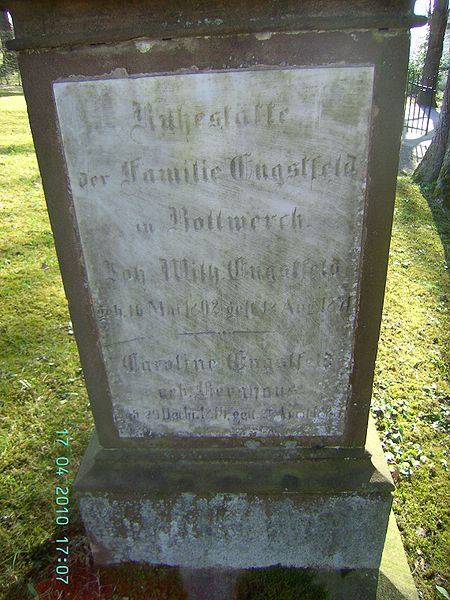 | aktuell | 19:57, 7. Jul. 2010 | 2.280 × 3.040 (1,43 MB) | Marlen (Diskussion • Beiträge) | {{Information |Beschreibung = Grabstein Engstfeld Bollwerk |Quelle = Friedhof Kierspe |Urheber = Marlen Vedder |Datum = |Scans = |Genehmigung = |Andere Versionen = |Anmerkungen = }} |