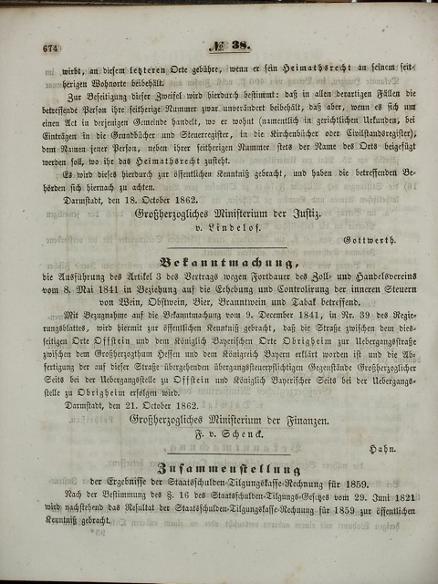 Grossherzoglich Hessisches Regierungsblatt Nr. 38 vom Oktober 1862, Seite 674 |