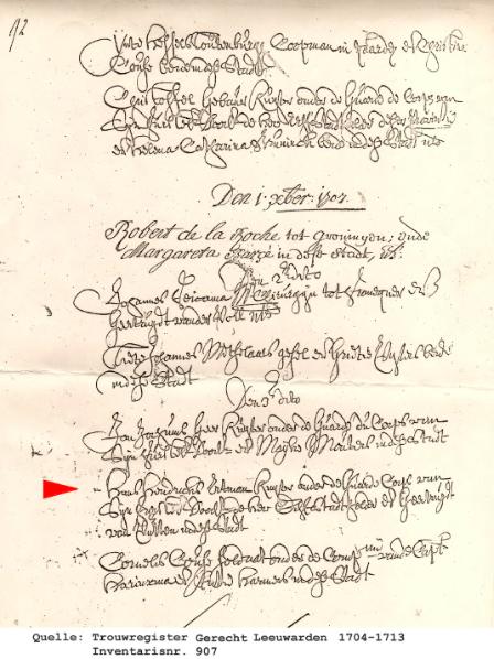 | aktuell | 15:03, 17. Mär. 2011 | 1.605 × 2.145, 2 Seiten (767 KB) | KlausErdmann (Diskussion • Beiträge) | {{Information |Beschreibung = ;Heiratsurkunden des Hans Hendrich Ertman:geheiratet 1707 in Leeuwarden (NL) |Quelle = Kopie Familienarchiv K.Erdmann |Urheber = Trowregister Gerecht Leeuwarden 1704-1713<br />Trowregister Hervormde gemeente Leeuwarden 1705- |