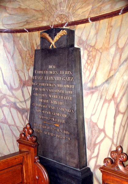 Gedenktstein dem EHRWÜRIGEN HERRN FRANZ LEONARD GARZ in der kath. Heilig-Kreuz Kirche von Hasselsweiler