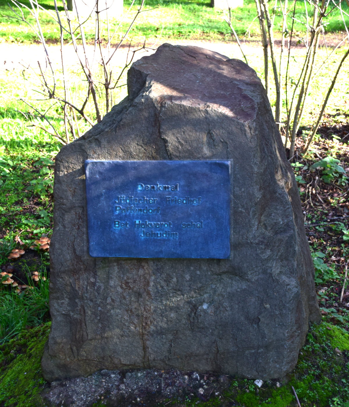 Stein mit Tafel am jüdischen Friedhof in Paffendorf | ||||