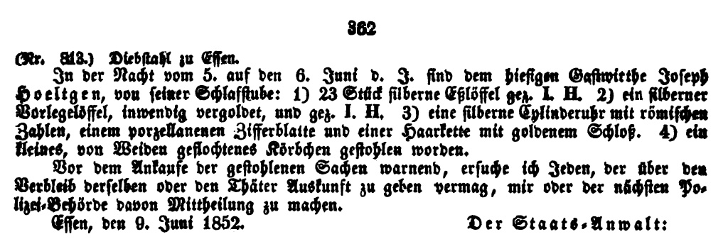 Dem Gastwirth Joseph Hoeltgen aus Essen werden in der Nacht vom 5. auf den 6. Juni 1852 aus seiner Schlafstube silberne Esslöffel, eine silberne Cylinderuhr und eine Haarkette mit goldenem Schloß gestohlen. | ||