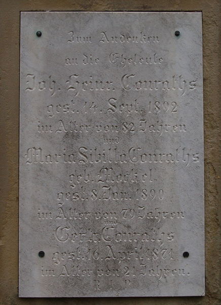 Grabinschrift für die Familie Conraths auf dem Friedhof an der alten Kirche in Kirdorf (Bedburg/Erft) | |||