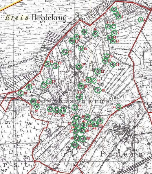 Einzeichnung der Gemeindegrenzen von 1938 durch Bernhard Waldmann, Einzeichnung der Höfe in Kischken durch Marieta Waldszus | ||||