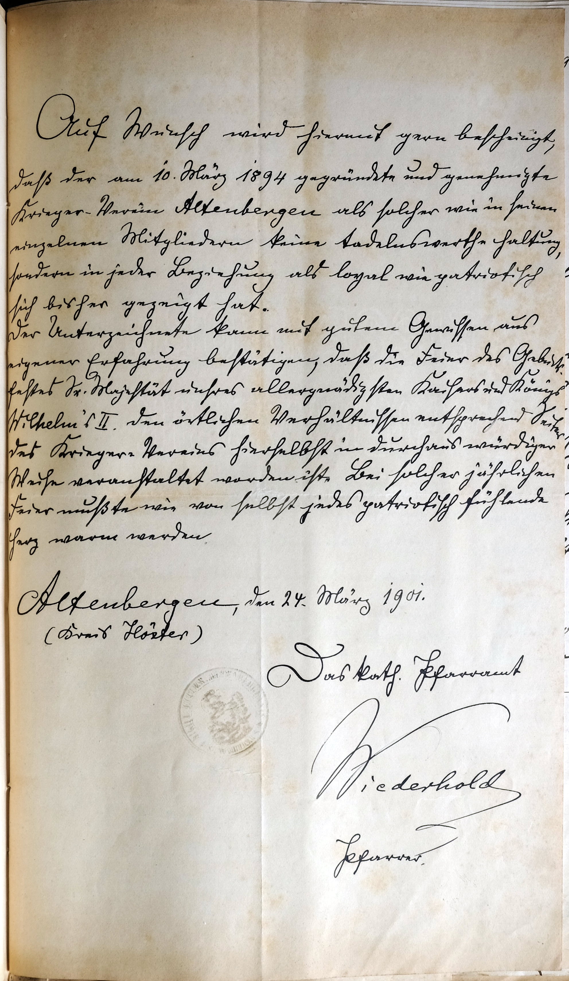 Datei:Kriegerverein-Altenbergen Unbedenklichkeit-1901.jpg
