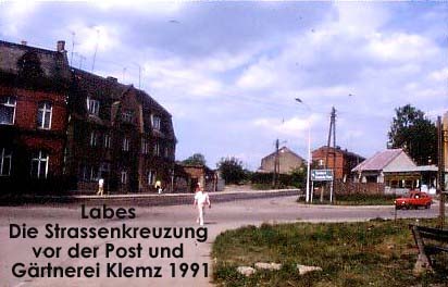 - Beschreibung: Labes Die Strassenkreuzung bei der Post und Gärtnerei Klemz 1991