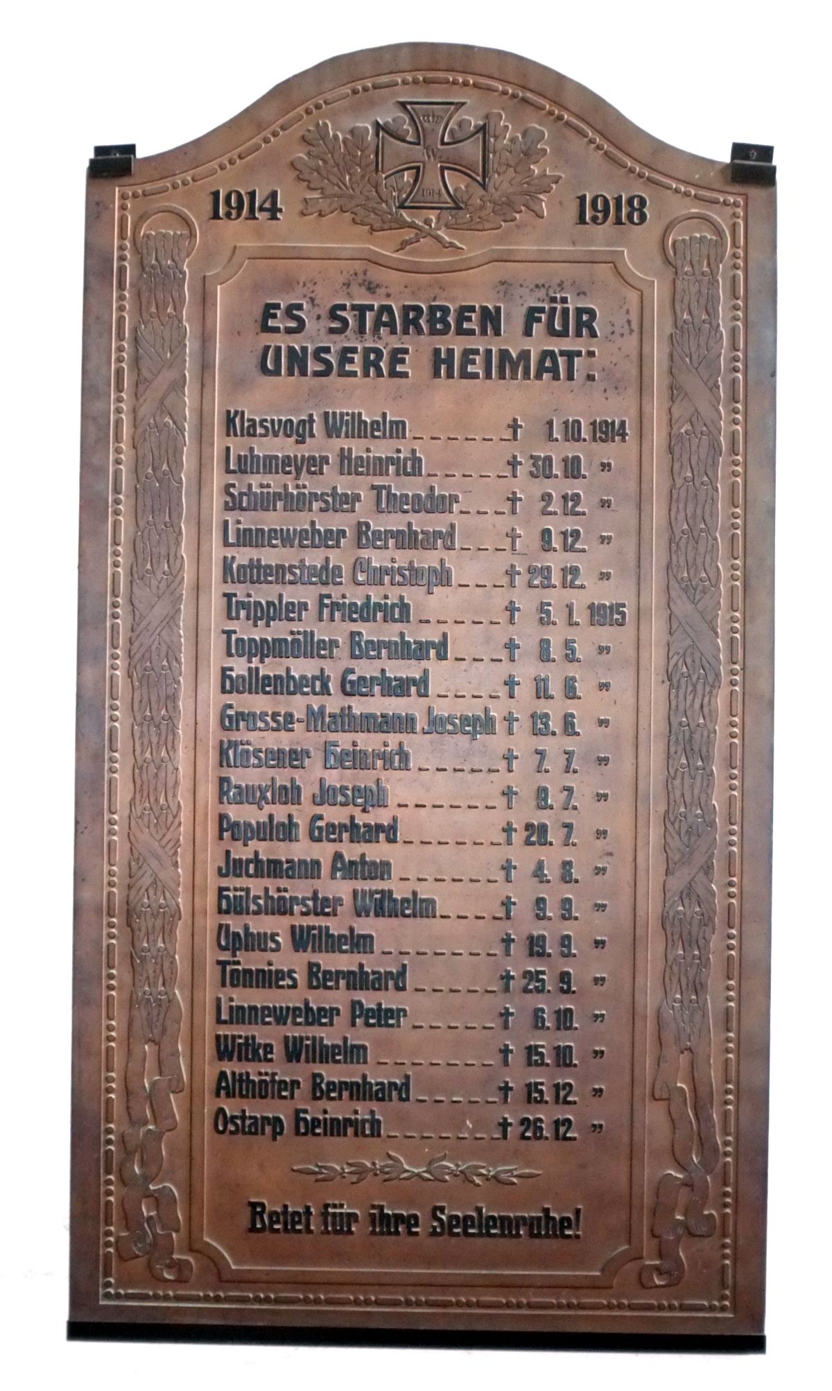 Gedenktafel für die Kriegsopfer des I. Weltkrieges 1914-1918 in der St. Vituskirche von Lette