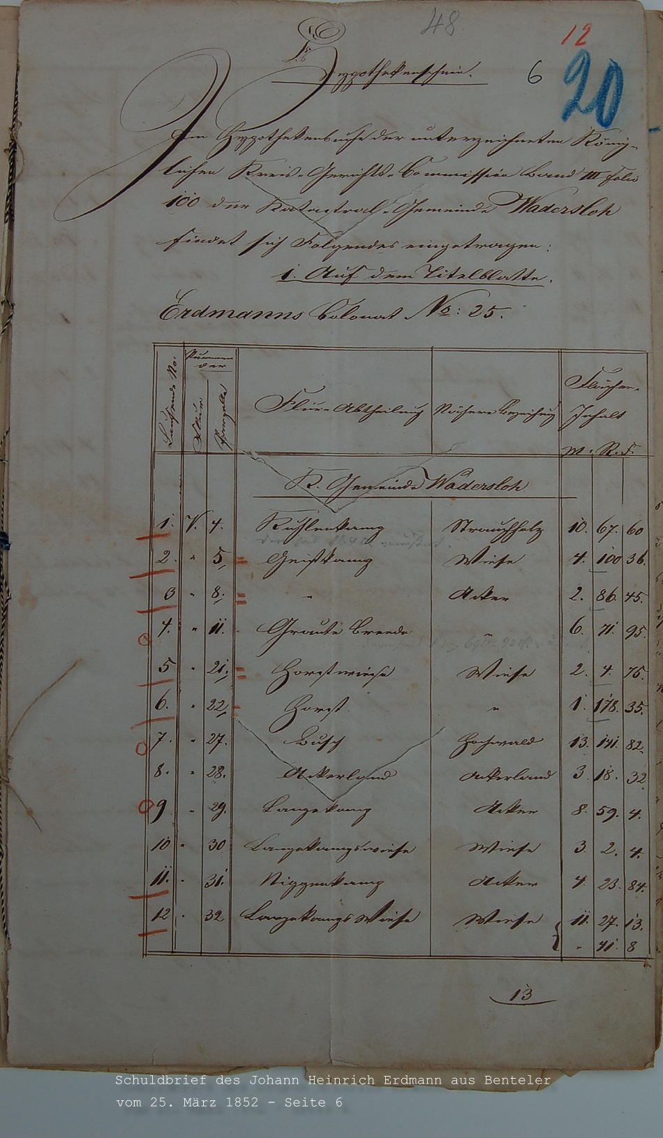 - Beschreibung: Schuldbrief von 1852, Seite 6 (Johann Heinrich Erdmann, Ksp. Wadersloh)