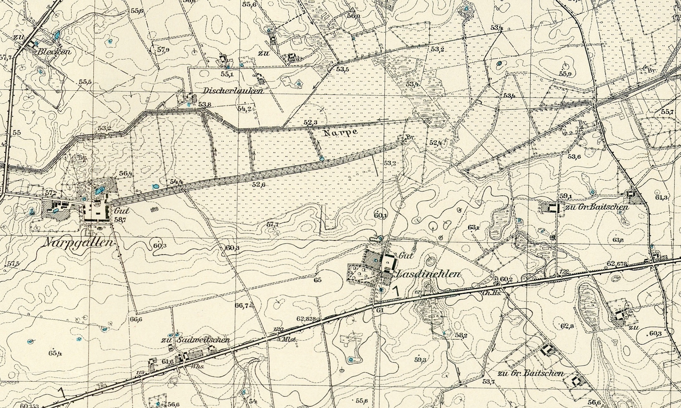 Lasdinehlen, ab 1938 GGut Altkrug, Kreis Gumbinnen auf dem MTB 1399 Brakuponen, Ostpreußen |