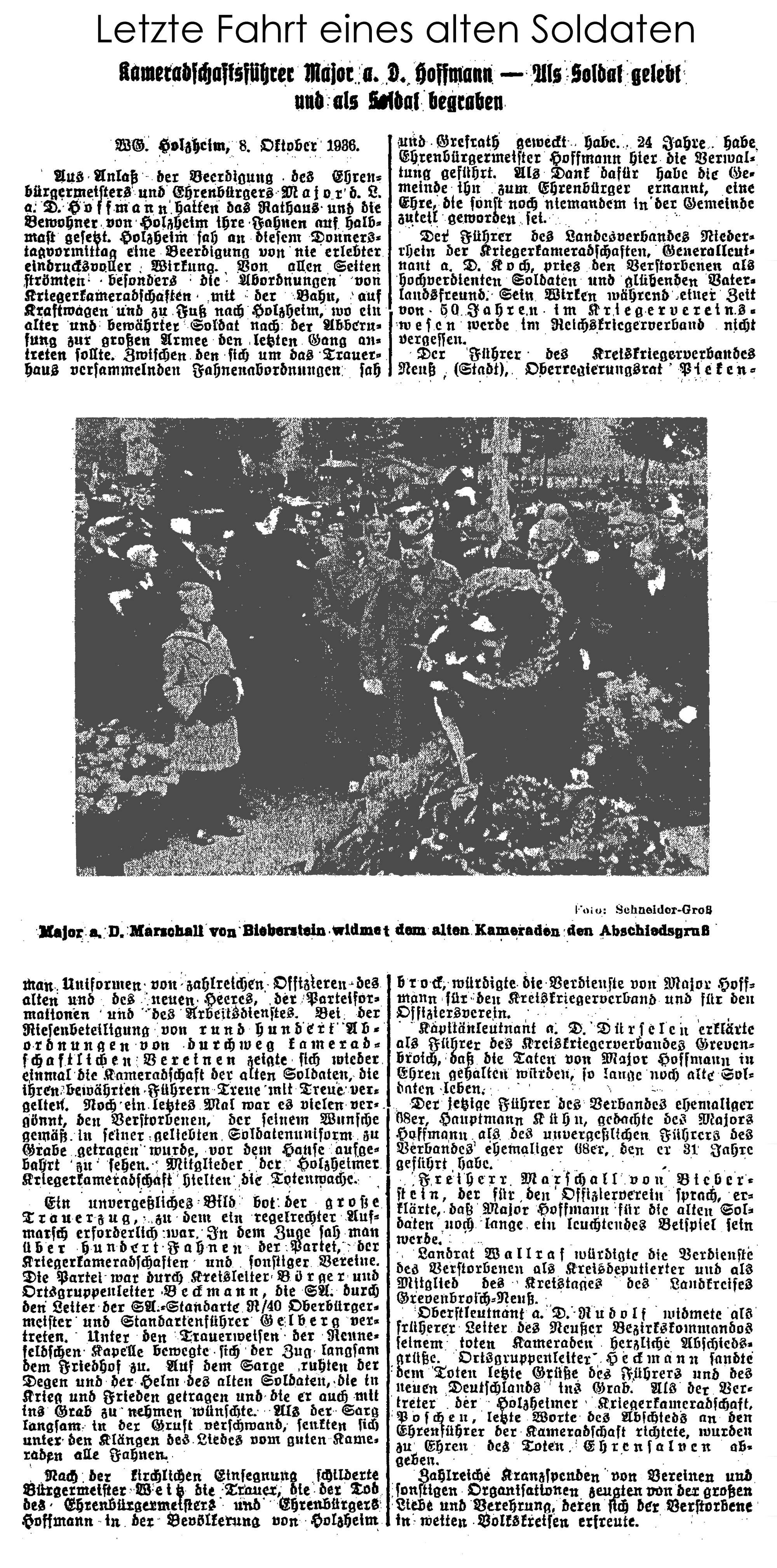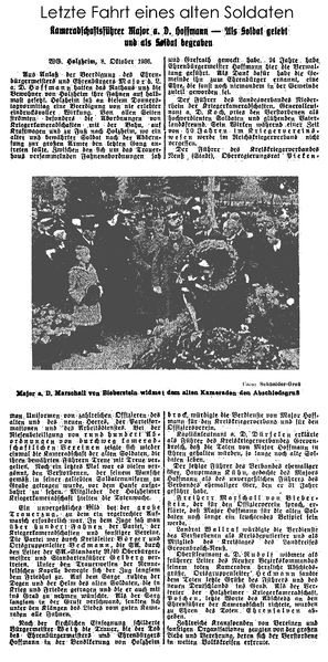 | aktuell | 14:01, 3. Mär. 2019 | 2.000 × 4.032 (1,83 MB) | KlausErdmann (Diskussion • Beiträge) | {{Information |Beschreibung = ;Zeitungsartikel vom 8. Oktober 1936 Letzte Fahrt eines alten Soldaten</br>Kameradschaftsführer Major a.D. Hoffmann - Als Soldat gelebt und als Soldat begraben |Quelle = |Urheber = |Datum = 2019 |Scans = [[User:KlausErdman |