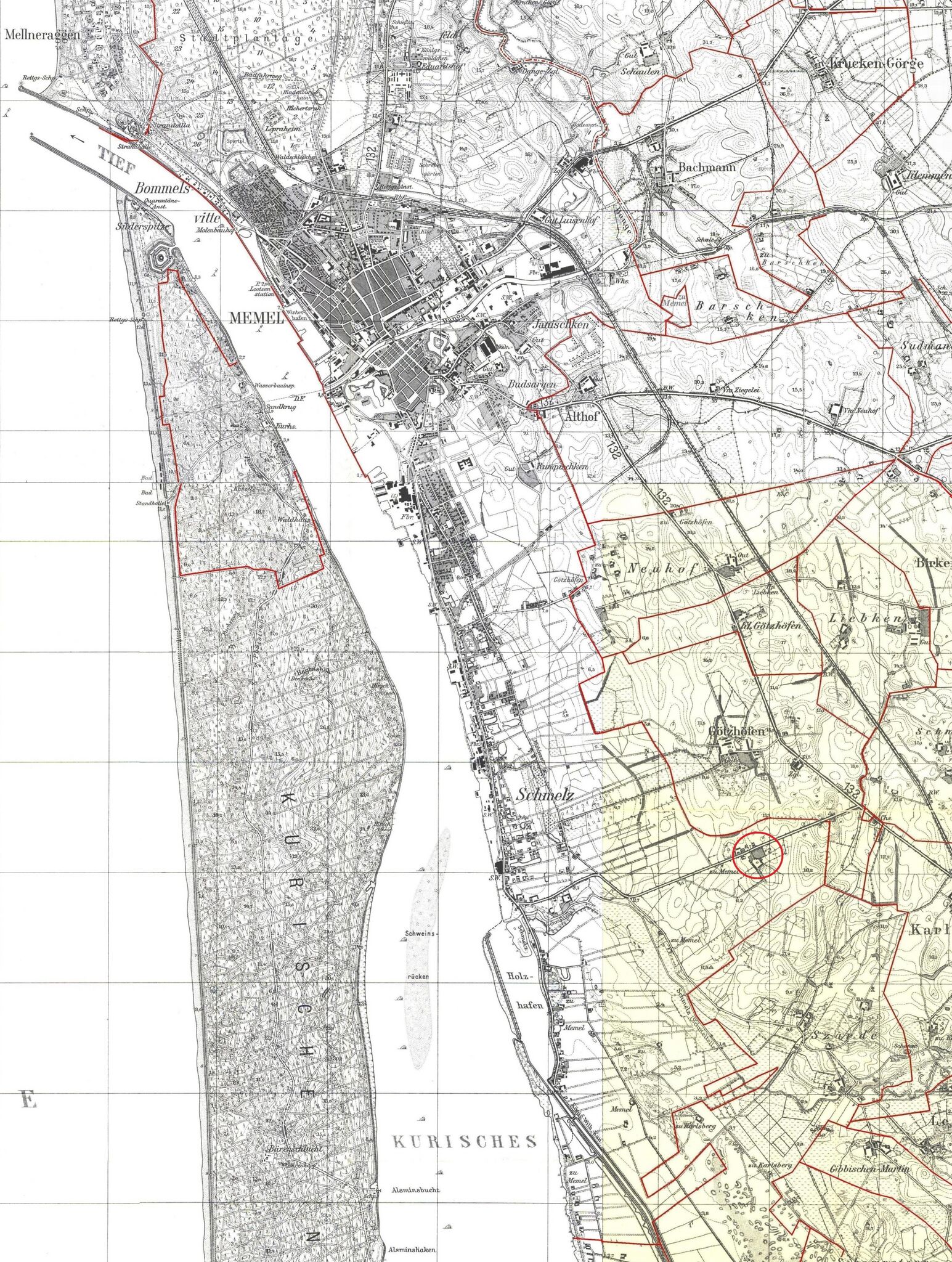 Ausschnitt aus dem Messtischblatt 0292 Memel, 0293 Plicken, 0392 Schmelz, 0393 Götzhöfen (1:25 000) | ||||