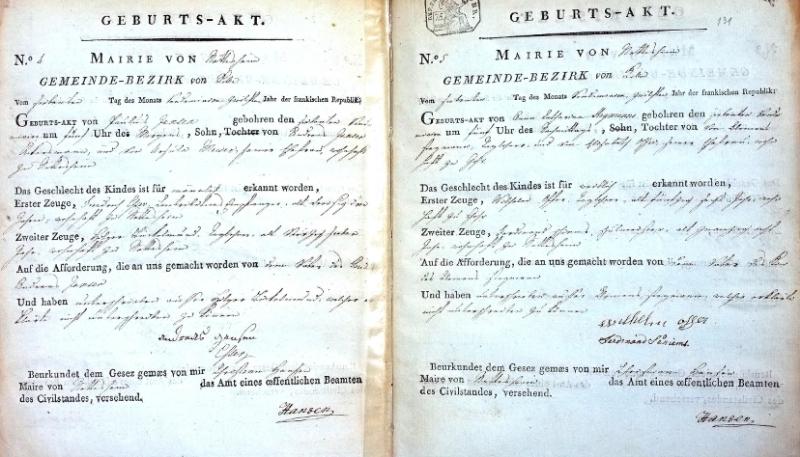 | aktuell | 08:34, 24. Aug. 2011 | 2.197 × 1.538, 40 Seiten (17,98 MB) | KlausErdmann (Diskussion • Beiträge) | {{Information |Beschreibung = ;Standesamt Nettesheim, Geburts-Register 1804:XII. Jahr der französischen Republik |Quelle = Gemeindearchiv Rommerskirchen |Urheber = |Datum = XII. Jahr der französischen Republik |Sc |