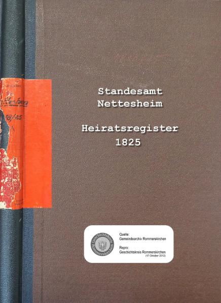 | aktuell | 19:30, 17. Okt. 2012 | 1.972 × 2.705, 11 Seiten (6,95 MB) | KlausErdmann (Diskussion • Beiträge) | {{Information |Beschreibung = ;Standesamt Nettesheim, Heiratsregister von 1825 |Quelle = Gemeindearchiv Rommerskirchen |Urheber = |Datum = 1825 |Scans = Klaus Erdmann ''(Repr |