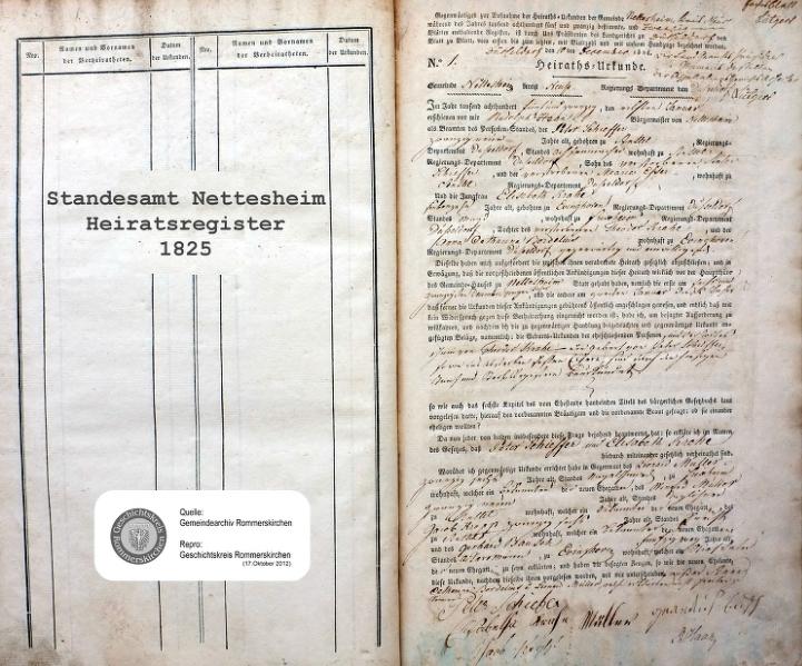 | aktuell | 19:30, 17. Okt. 2012 | 1.972 × 2.705, 11 Seiten (6,95 MB) | KlausErdmann (Diskussion • Beiträge) | {{Information |Beschreibung = ;Standesamt Nettesheim, Heiratsregister von 1825 |Quelle = Gemeindearchiv Rommerskirchen |Urheber = |Datum = 1825 |Scans = Klaus Erdmann ''(Repr |
