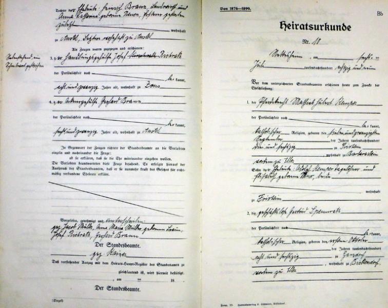 | aktuell | 09:46, 11. Nov. 2012 | 1.354 × 1.933, 22 Seiten (5,51 MB) | KlausErdmann (Diskussion • Beiträge) | {{Information |Beschreibung = ;Standesamt Nettesheim, Heiratsregister von 1888 |Quelle = Gemeindearchiv Rommerskirchen |Urheber = |Datum = 1888 |Scans = Klaus Erdmann ''(Repr |