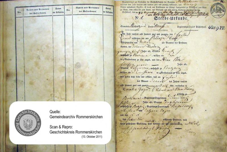 | aktuell | 16:05, 14. Okt. 2011 | 1.015 × 1.492, 48 Seiten (8,36 MB) | KlausErdmann (Diskussion • Beiträge) | {{Information |Beschreibung = ;Standesamt Nettesheim, Sterbeurkunden von 1822 |Quelle = Gemeindearchiv Rommerskirchen |Urheber = |Datum = 1822 |Scans = Klaus Erdmann ''(Repro: 13. Oktober 2011) |