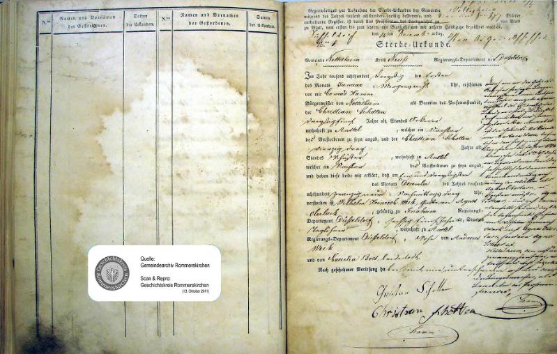 | aktuell | 10:40, 15. Okt. 2011 | 1.146 × 1.353, 39 Seiten (7,89 MB) | KlausErdmann (Diskussion • Beiträge) | {{Information |Beschreibung = ;Standesamt Nettesheim, Sterbeurkunden von 1830 |Quelle = Gemeindearchiv Rommerskirchen |Urheber = |Datum = 1830 |Scans = Klaus Erdmann ''(Repro: 13. Oktober 2011) |